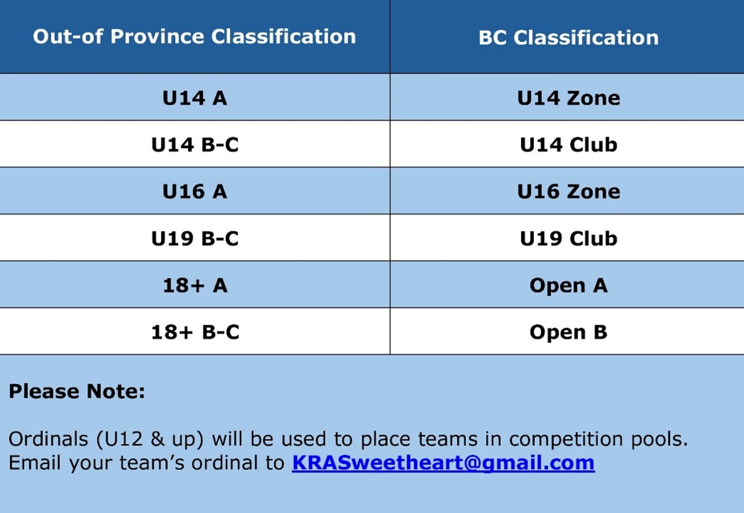 Any changes to your team roster (including player pickup requests) must be on the Team Adjustment Form (TAF) from Ringette BC and submitted to krasweetheart@gmail.com by January 17, 2026. As this is a RBC sanctioned tournament, RBC must approve these changes in order for your adjusted roster to play at the Tournament. Should your team make any unapproved (RBC) changes to the roster during the tournament, it may mean that your team will FORFEIT that game, regardless of the game outcome.